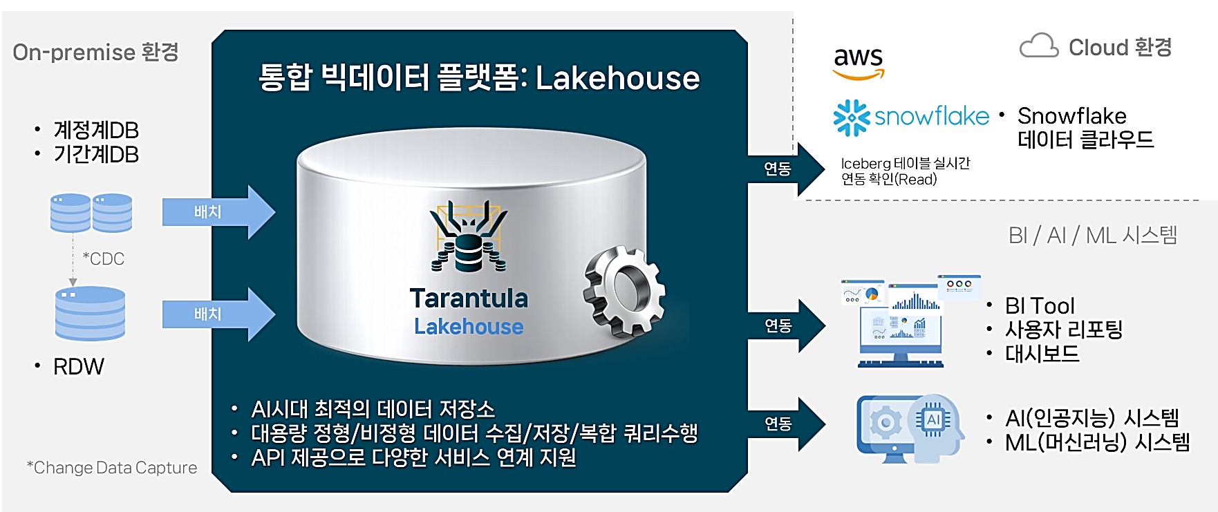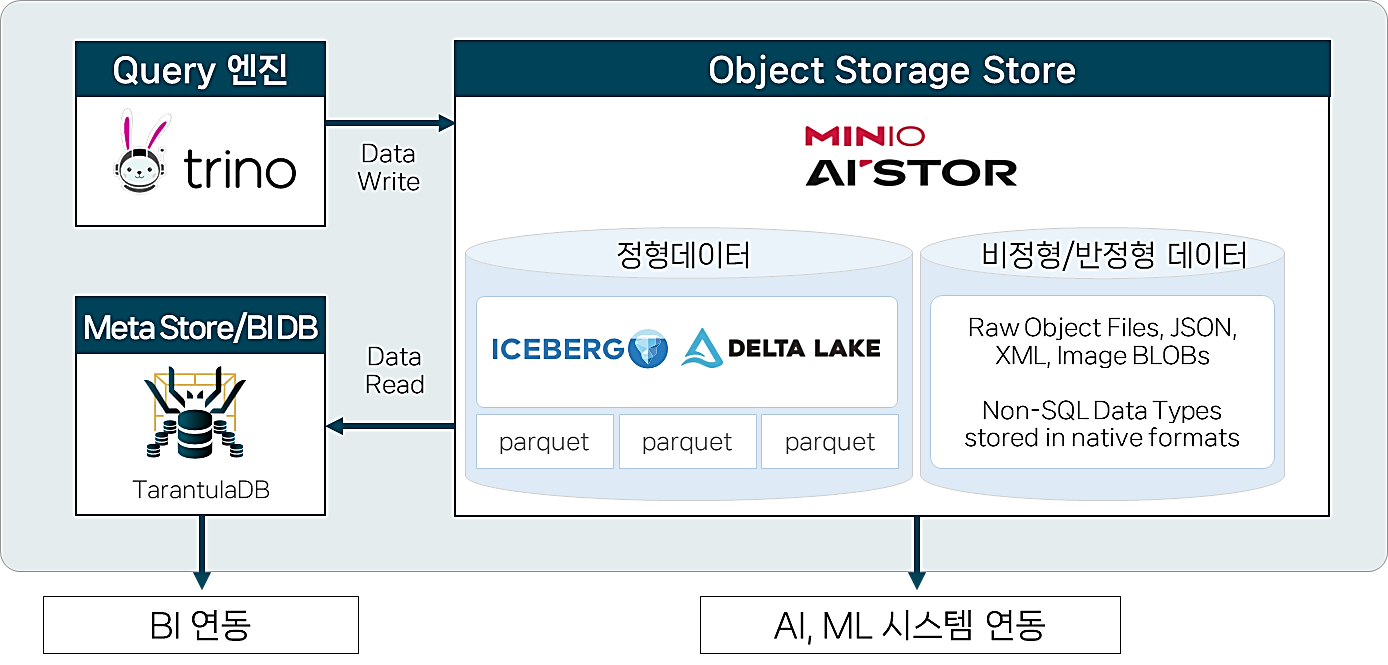 타란툴라 Lakehouse는 다양한 원천 데이터를 유연하게 수집하여 고성능 스토리지에 저장하고, BI 및 AI/ML로 연계하는 ‘개방형 통합 빅데이터 저장소’ 입니다. 개방형 통합 빅데이터 플랫폼 : Lakehouse 타란툴라 Lakehouse 주요기능 1. 통합된 SQL 쿼리 엔진Oracle, SAP Hana 등 기업의 다양한 데이터 소스를 하나의 SQL 인터페이스로 조회하고 분석할 수 있습니다. 2. ACID 트랜잭션 지원데이터 쓰기, 업데이트, 삭제 등 모든 작업에 대해 정합성, 일관성, 복구 가능성을 보장합니다. 3. 고급 쿼리 최적화 조건자 푸시다운, 프루닝, 메타Data 및 파티션 최적화 등, 다양한 기술을 통해 대용량 데이터도 빠르고 효율적으로 처리합니다. 4. 스토리지-컴퓨팅 분리 아키텍처 저장은 오브젝트 스토리지에, 처리는 필요할 때 유연하게- 리소스 낭비 없이 빠르고 안정적인 분석이 가능합니다 타란툴라 Lakehouse 구성요소 글로벌 No.1 오픈소스 컴포넌트로 구성되어 성능, 확장성, 개방성이 뛰어납니다. 1. 쿼리 엔진 – Trino다양한 데이터 소스를 대상으로 SQL을 사용해 빠르게 분석하는 분산형 *MPP SQL 쿼리 엔진 2. 오브젝트 스토리지 저장소 – Minio AIStorAI 및 대규모 데이터 워크로드를 위해 설계된 온프레미스 고성능 오브젝트 스토리지 플랫폼 3. 메타저장소/BI DB – TarantulaDBICEBERG 카탈로그 저장 Meta DB로 ICEBERG 테이블 조회 용도(Trino Bridge 자체 개발) 및 향후 Vector DB Extension 타란툴라 Lakehouse 특장점 1. 하나로 끝내는 데이터 플랫폼Tarantula Lakehouse는 빅데이터 시스템을 구성요소로 포함하고 있어 별도로 빅데이터 시스템 구축이 불필요합니다. 2. On-prem 대규모 분석 지원보안 데이터는 내부에 보관하여 안전하게 처리할 수 있으며, 클라우드 컴퓨팅 파워 없이도 대규모 분석이 용이합니다. 3. 개방성과 유연성 AWS, Snowflake 등 클라우드 서비스와 실시간 연동할 수 있으며, 기업 내부의 AI/ML 연동이 용이합니다. 4. 엔터프라이즈 기술지원 글로벌 No.1 오픈소스 컴포넌트로 이루어져 합리적인 비용과 성능, 안정성을 제공하며, 엔터프라이즈급의 탄탄한 기술지원을 받으실 수 있습니다.