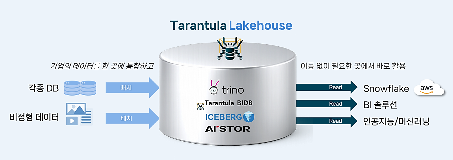 타란툴라 Lakehouse는 다양한 원천 데이터를 유연하게 수집하여 고성능 스토리지에 저장하고, BI 및 AI/ML로 연계하는 ‘개방형 통합 데이터 플랫폼’ 입니다. 개방형 통합 데이터 플랫폼 : Lakehouse 타란툴라 Lakehouse 주요기능 1. 통합된 SQL 쿼리 엔진Oracle, SAP Hana 등 기업의 다양한 데이터 소스를 하나의 SQL 인터페이스로 조회하고 분석할 수 있습니다. 2. ACID 트랜잭션 지원데이터 쓰기, 업데이트, 삭제 등 모든 작업에 대해 정합성, 일관성, 복구 가능성을 보장합니다. 3. 고급 쿼리 최적화 조건자 푸시다운, 프루닝, 메타Data 및 파티션 최적화 등, 다양한 기술을 통해 대용량 데이터도 빠르고 효율적으로 처리합니다. 4. 스토리지-컴퓨팅 분리 아키텍처 저장은 오브젝트 스토리지에, 처리는 필요할 때 유연하게- 리소스 낭비 없이 빠르고 안정적인 분석이 가능합니다 타란툴라 Lakehouse 구성요소 글로벌 No.1 오픈소스 컴포넌트로 구성되어 성능, 확장성, 개방성이 뛰어납니다. 1. 쿼리 엔진 – Trino다양한 데이터 소스를 대상으로 SQL을 사용해 빠르게 분석하는 분산형 *MPP SQL 쿼리 엔진 2. 오브젝트 스토리지 저장소 – Minio AIStorAI 및 대규모 데이터 워크로드를 위해 설계된 온프레미스 고성능 오브젝트 스토리지 플랫폼 3. 메타저장소/BI DB – TarantulaDBICEBERG 카탈로그 저장 Meta DB로 ICEBERG 테이블 조회 용도(Trino Bridge 자체 개발) 및 향후 Vector DB Extension 타란툴라 Lakehouse 특장점 1. 하나로 끝내는 데이터 플랫폼Tarantula Lakehouse는 빅데이터 시스템을 구성요소로 포함하고 있어 별도로 빅데이터 시스템 구축이 불필요합니다. 2. On-prem 대규모 분석 지원보안 데이터는 내부에 보관하여 안전하게 처리할 수 있으며, 클라우드 컴퓨팅 파워 없이도 대규모 분석이 용이합니다. 3. 개방성과 유연성 AWS, Snowflake 등 클라우드 서비스와 실시간 연동할 수 있으며, 기업 내부의 AI/ML 연동이 용이합니다. 4. 엔터프라이즈 기술지원 글로벌 No.1 오픈소스 컴포넌트로 이루어져 합리적인 비용과 성능, 안정성을 제공하며, 엔터프라이즈급의 탄탄한 기술지원을 받으실 수 있습니다.